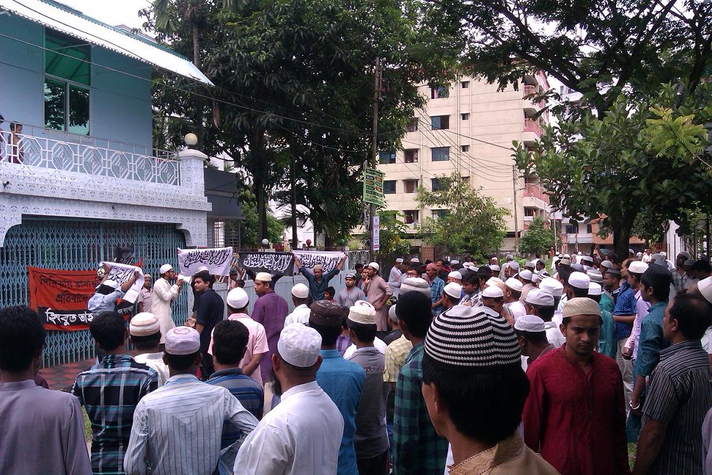 Hizb ut Tahrir organized protest meetings today in front of mosques across Dhaka, Chittagong and Sylhet to protest against the horrific chemical weapons attack upon the Muslims in Syria by the tyrant and agent of America, Bashar al-Assad. Speakers at the protest meetings strongly condemned the heinous actions of the criminal Bashar regime against the Muslims. They also highlighted and condemned the connivance of the so-called international community, particularly crusader America and Russia, with the Bashar regime. It is they who have given Bashar the green light to commit the most brutal atrocities against the Muslims in their attempt to foil the Islamic uprising of the people in Syria for establishing the Khilafah "Caliphate".