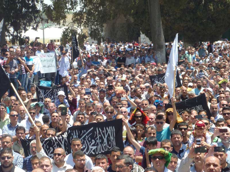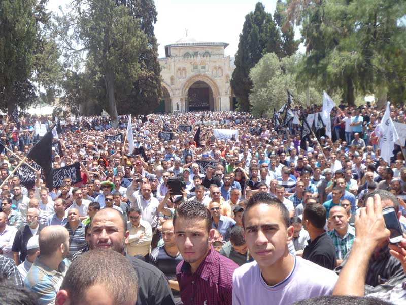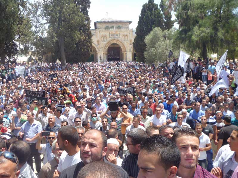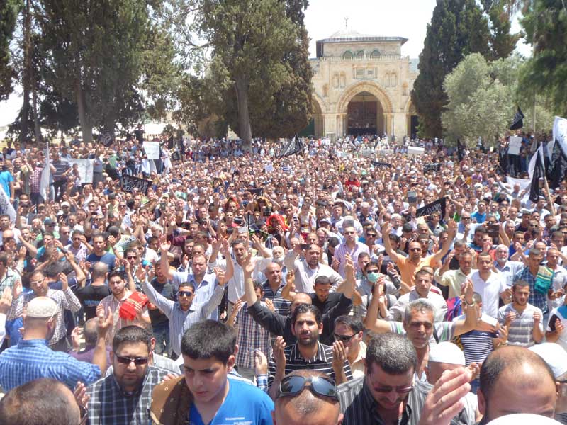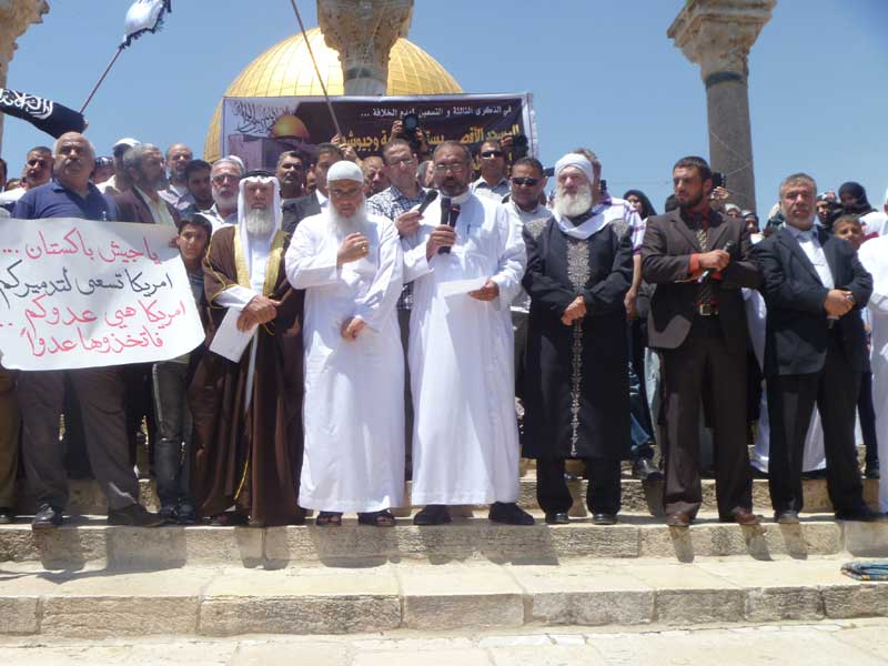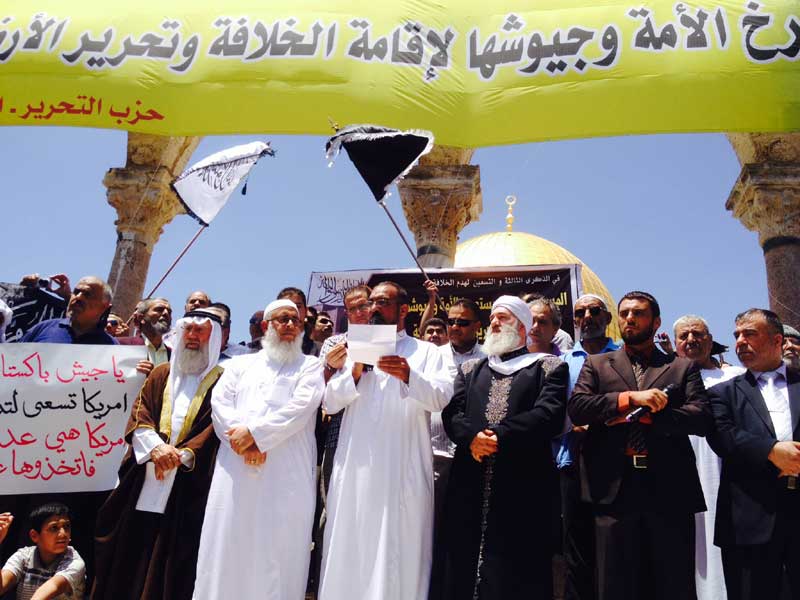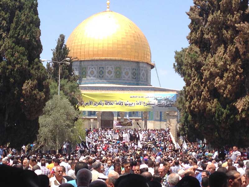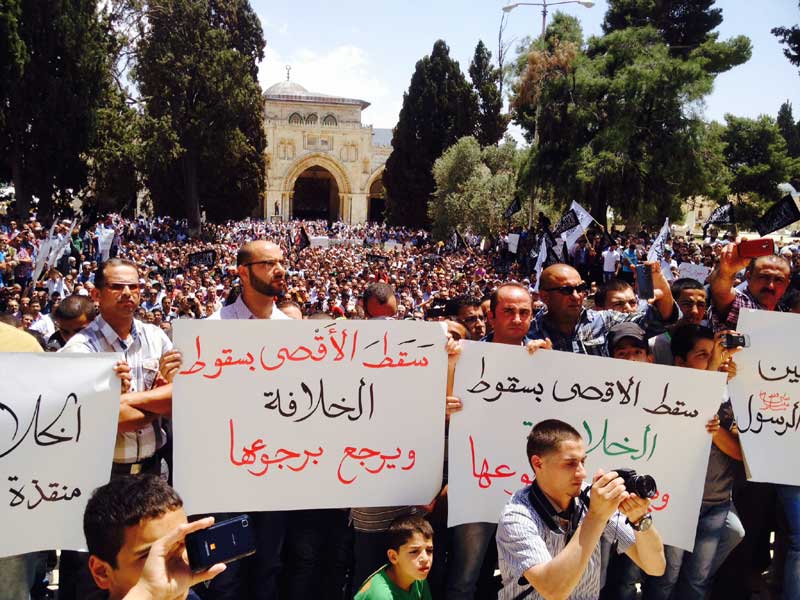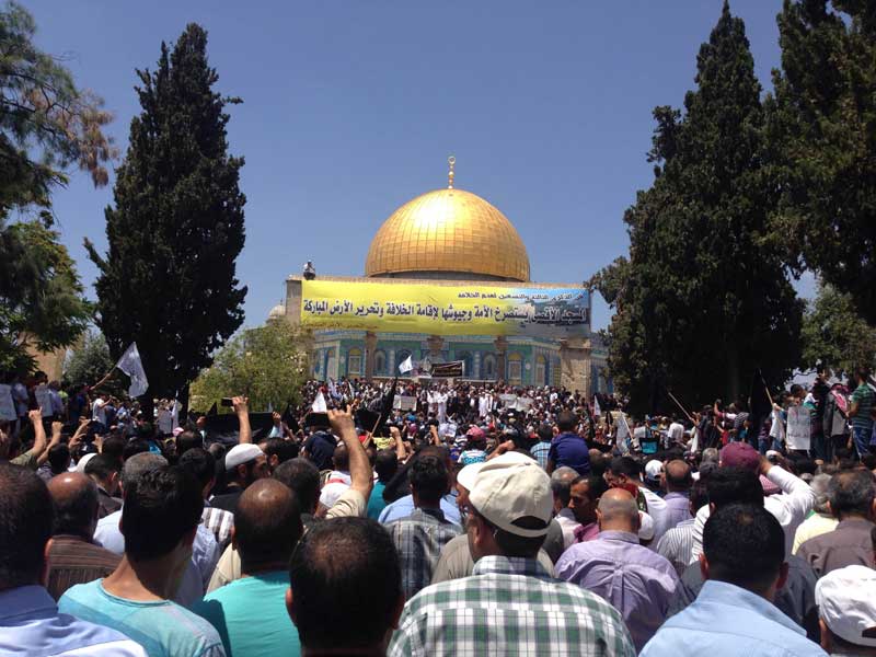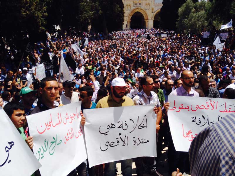 Large crowds gathered outside the Aqsa Mosque after the Friday prayer, 24 Rajab 1435 AH corresponding to 23 May 2014 CE, to call onto the Muslim Ummah and the armies to establish the Khilafah "Caliphate" and liberate Palestine from the Jewish occupation. People from the West Bank who were able to reach the Aqsa Mosque participated as well.