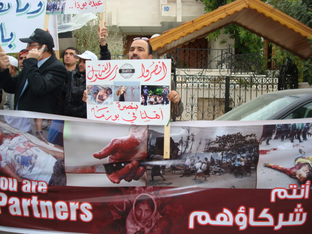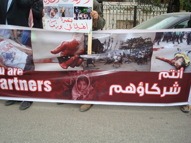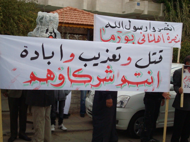 Alhamdulilah through Allah's Guidance Hizb-ut Tahrir/ Wilayah Jordan organized a protest in front of the Bangladesh Embassy in Amman on Sunday 26 Dhul Hijjah 1433 H, 11 November 2012. The protest was titled: "You Are Their Partner" amid a heavy security presence. Loud chants of Allahu Akbar soared throughout the place, alongside chants scolding Hasina's lowly regime. Several speeches were given; demanding the mobilizing of the Bangladesh armies to rescue Myanmar Muslims from their despair. A committee from Hizb-ut Tahrir / Wilayah Jordan submitted an open communique to the Deputy Ambassador in Amman addressed to the leaders of Bangladesh. A press release was also issued by Hizb-ut Tahrir / Wilayah Jordan.