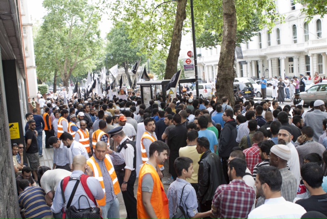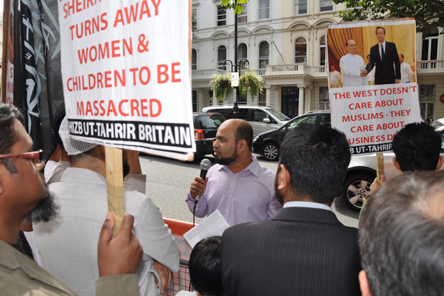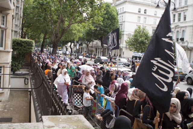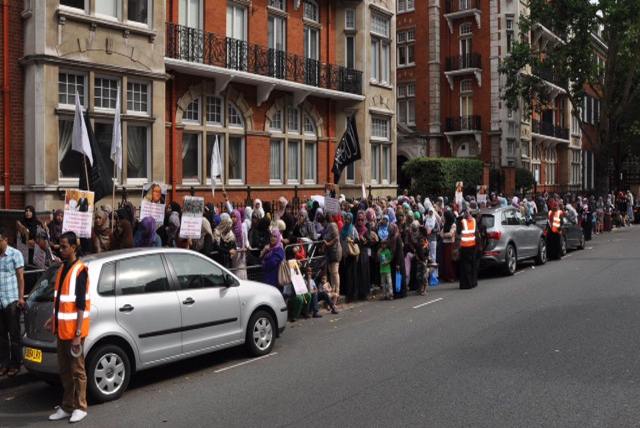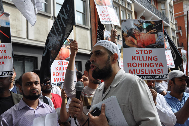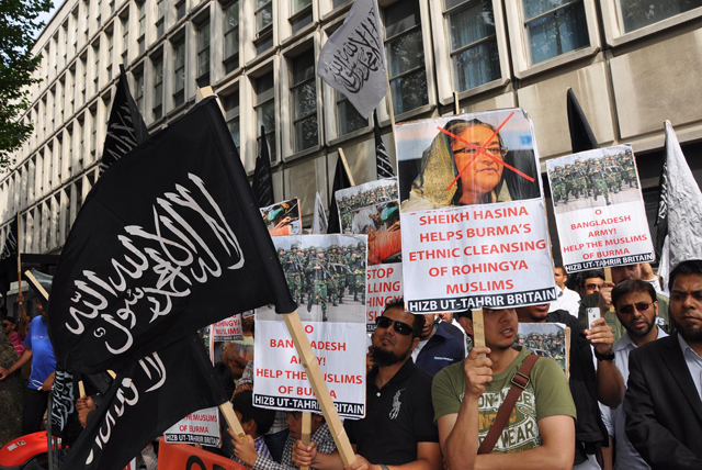 London UK, 11th August 2012 - Hundreds of Muslims gathered at the Bangladesh High Commission in London to protest against Sheikh Hasina's goverment's closure of the Bangladesh border to Rohingya Muslims fleeing brutal persecution in Burma (Myanmar). The demonstration was organised by Hizb ut-Tahrir in Britain.
