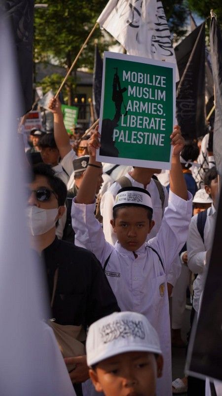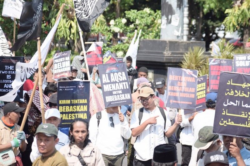 Tausende Muslime demonstrierten am 18. und 19. Oktober 2025 in verschiedenen indonesischen Städten unter dem Motto „Palästina ist weiterhin besetzt“. In Bandung versammelten sich über 15.000 Demonstranten vor dem Gedung-Sati-Gebäude und schwenkten Raya-Flaggen mit dem islamischen Glaubensbekenntnis (Schahada) sowie Schilder mit Slogans wie „Schickt die islamischen Armeen, befreit Palästina!“, „Die endgültige Lösung für Palästina liegt im Dschihad und im Kalifat“ und „Palästina wird durch das Kalifat und den Dschihad befreit werden“.