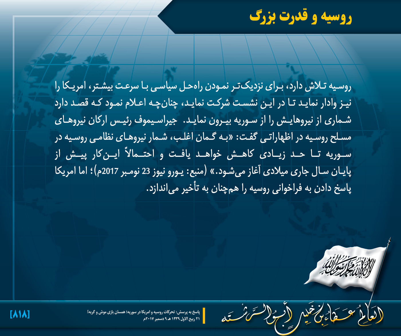21 ربیع الاول 1439 مطابق شنبه, 09 دسامبر 2017م بسم الله الرحمن الرحيم روسیه و قدرت بزرگ مطالب مرتبط: « وفاء ترامپ و وفاء حکام مسلمانها تبریک و تهنیۀ عطاء بن خلیل ابوالرشته، امیر حزبالتحریر به من مناسبت فرا رسیدن ماه مبارک رمضان سال 1443هـ.ق موافق با 2022م » ابراز نظر نمایید اسم * ایمیل * آدرس انترنتی دو کلمه زیر را وارد نمایید! پیام * پیام تان... back to top