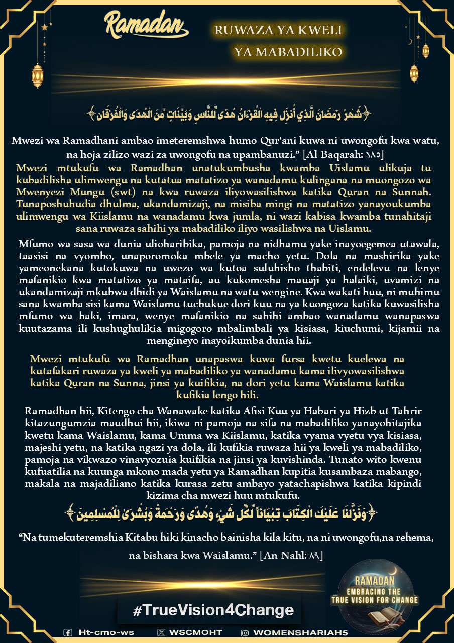 Wakati wa mwezi huu mtukufu, Kitengo cha Wanawake katika Afisi Kuu ya Habari ya Hizb ut Tahrir kitazungumzia maudhui hii, ikiwa ni pamoja na sifa na mabadiliko yanayohitajika kwetu kama Waislamu, kama Umma wa Kiislamu, katika vyama vyetu vya kisiasa, majeshi yetu, na katika ngazi ya dola, ili kufikia ruwaza hii ya kweli ya mabadiliko, pamoja na vikwazo vinavyozuia kuifikia na jinsi ya kuvishinda.