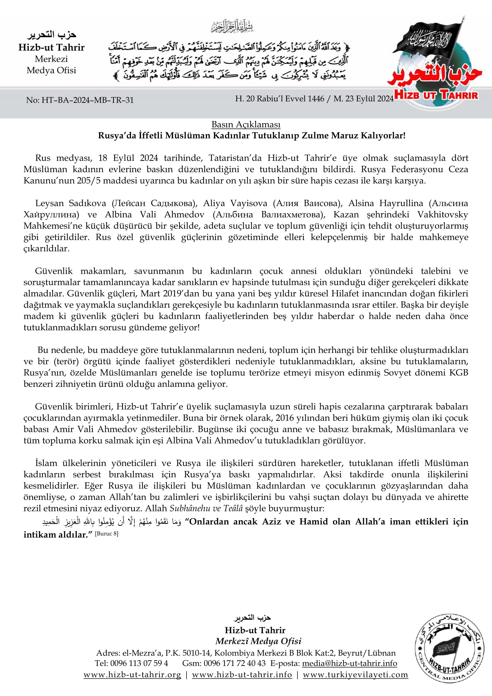 Rus medyası, 18 Eylül 2024 tarihinde, Tataristan’da Hizb-ut Tahrir’e üye olmak suçlamasıyla dört Müslüman kadının evlerine baskın düzenlendiğini ve tutuklandığını bildirdi. Rusya Federasyonu Ceza Kanunu’nun 205/5 maddesi uyarınca bu kadınlar on yılı aşkın bir süre hapis cezası ile karşı karşıya.