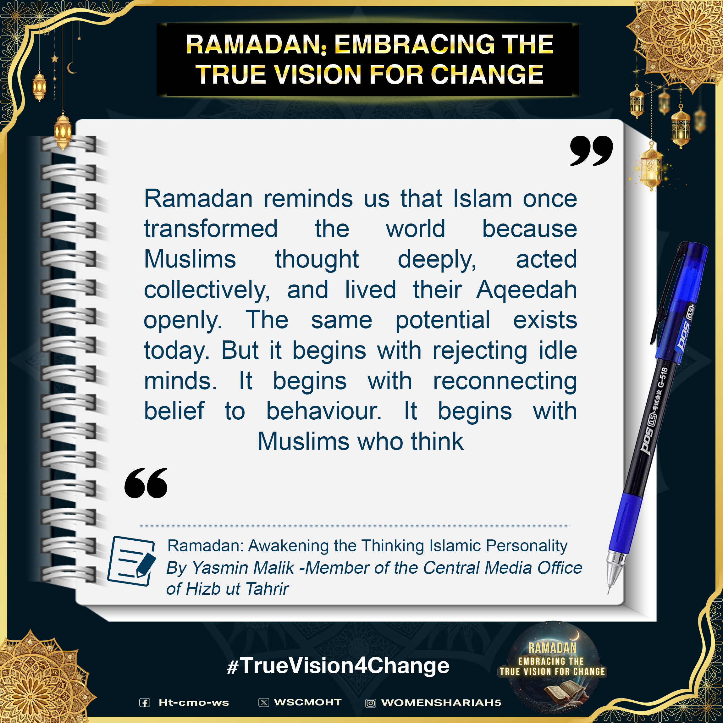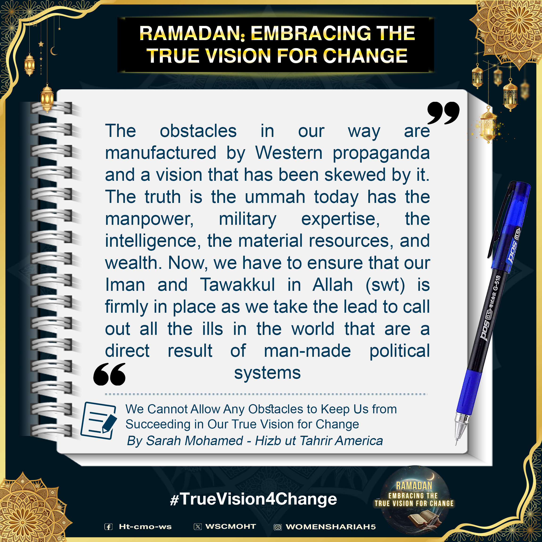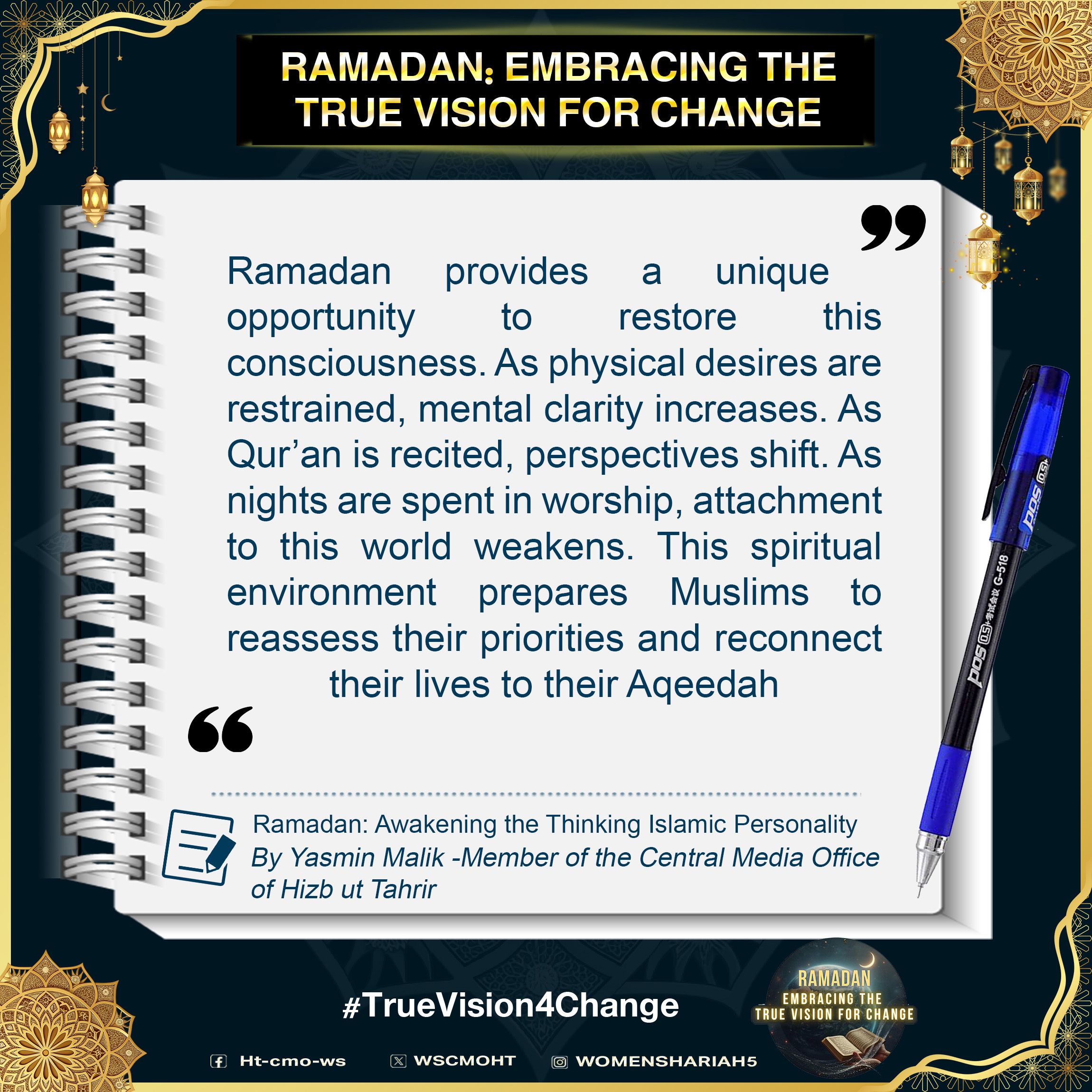 اس بابرکت مہینے میں، حزب التحریر کے مرکزی میڈیا آفس کا خواتین سیکشن اس موضوع پر خطاب کرے گا، جس میں بطور مسلمان، امت اسلامی، ہماری سیاسی جماعتوں، ہماری فوجوں اور ریاستی سطح پر تبدیلی کے اس حقیقی وژن کو حاصل کرنے کے لیے اپنے اندر ضروری خصوصیات اور تبدیلیاں شامل ہیں۔ یہ اس کے حصول کی راہ میں حائل رکاوٹوں اور ان پر قابو پانے کے طریقوں پر بھی بات کرے گا۔