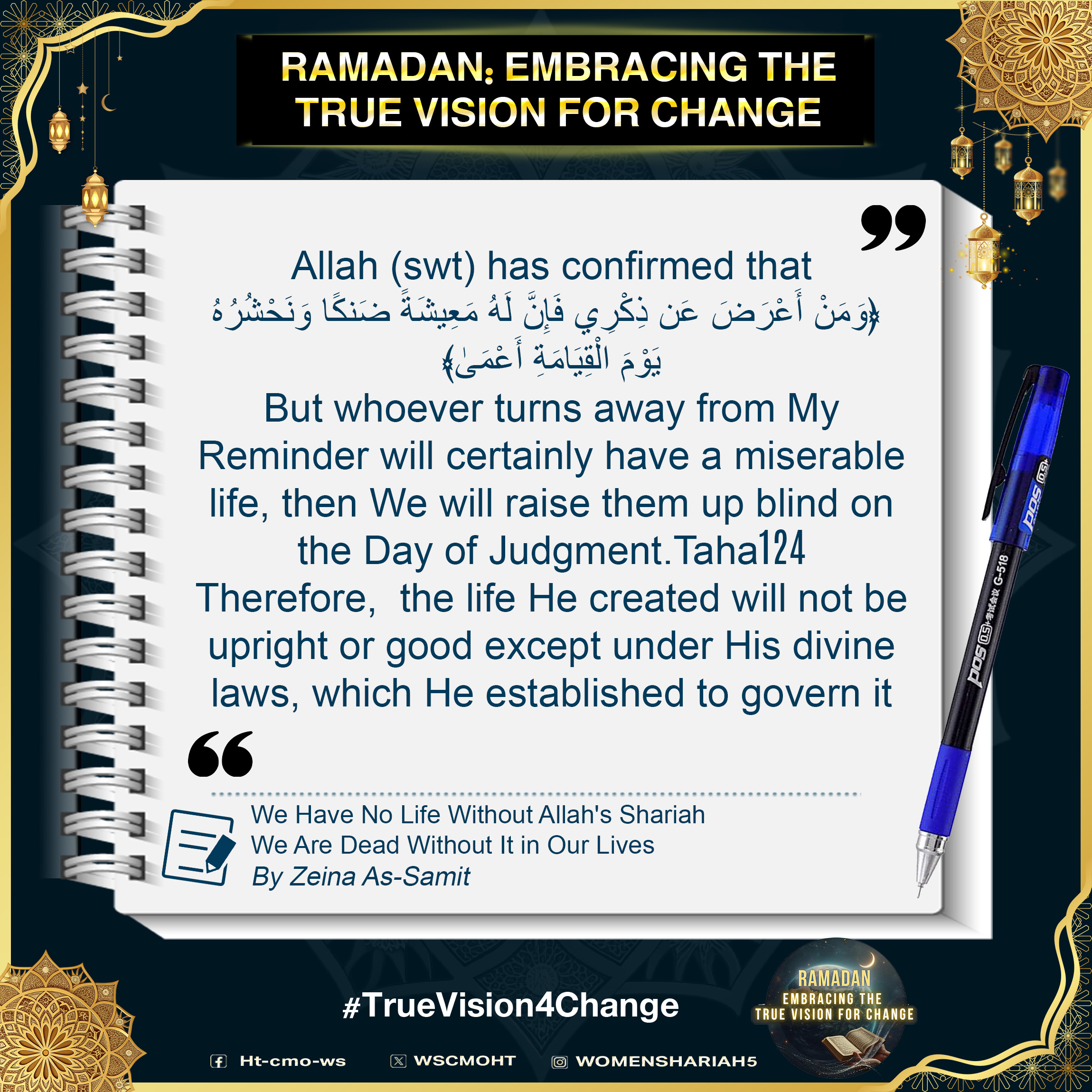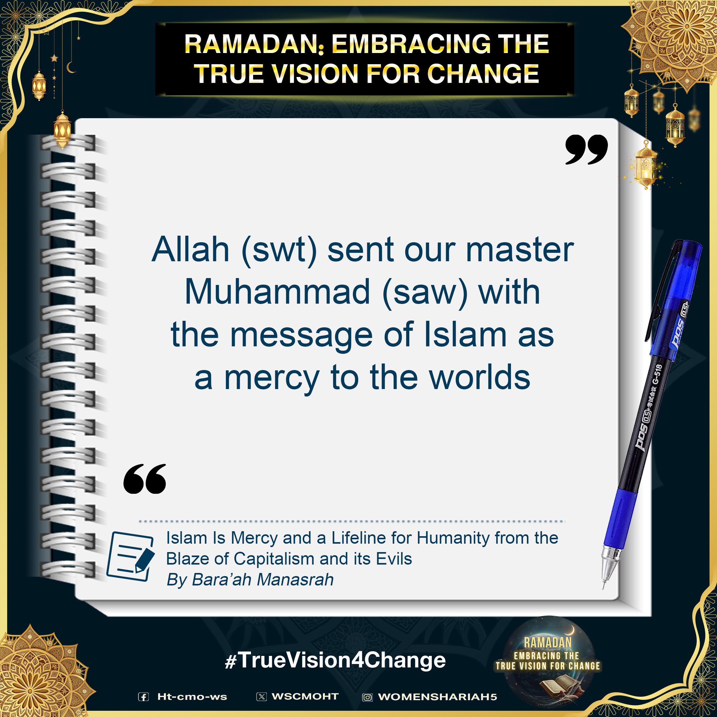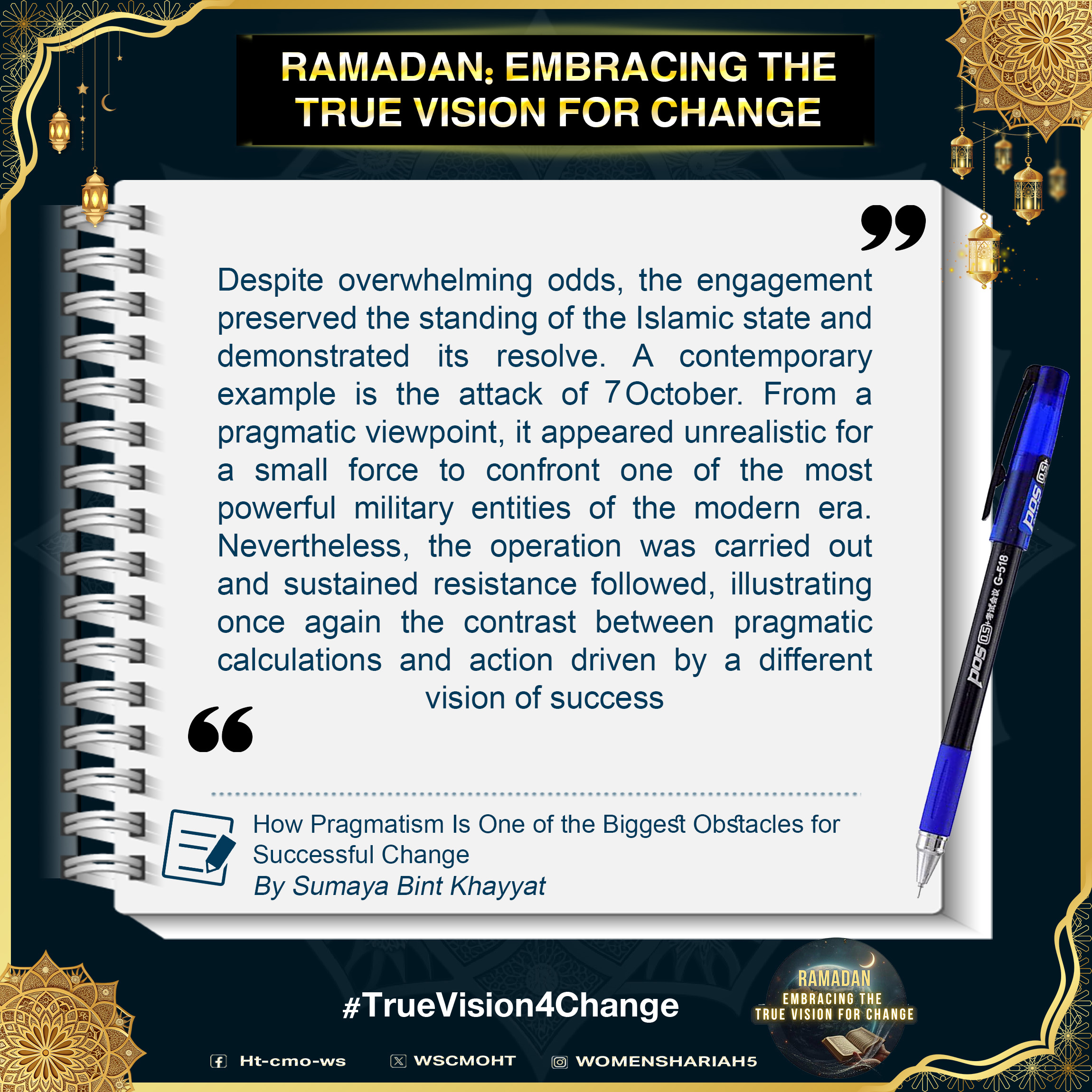 اس بابرکت مہینے میں، حزب التحریر کے مرکزی میڈیا آفس کا خواتین سیکشن اس موضوع پر خطاب کرے گا، جس میں بطور مسلمان، امت اسلامی، ہماری سیاسی جماعتوں، ہماری فوجوں اور ریاستی سطح پر تبدیلی کے اس حقیقی وژن کو حاصل کرنے کے لیے اپنے اندر ضروری خصوصیات اور تبدیلیاں شامل ہیں۔ یہ اس کے حصول کی راہ میں حائل رکاوٹوں اور ان پر قابو پانے کے طریقوں پر بھی بات کرے گا۔