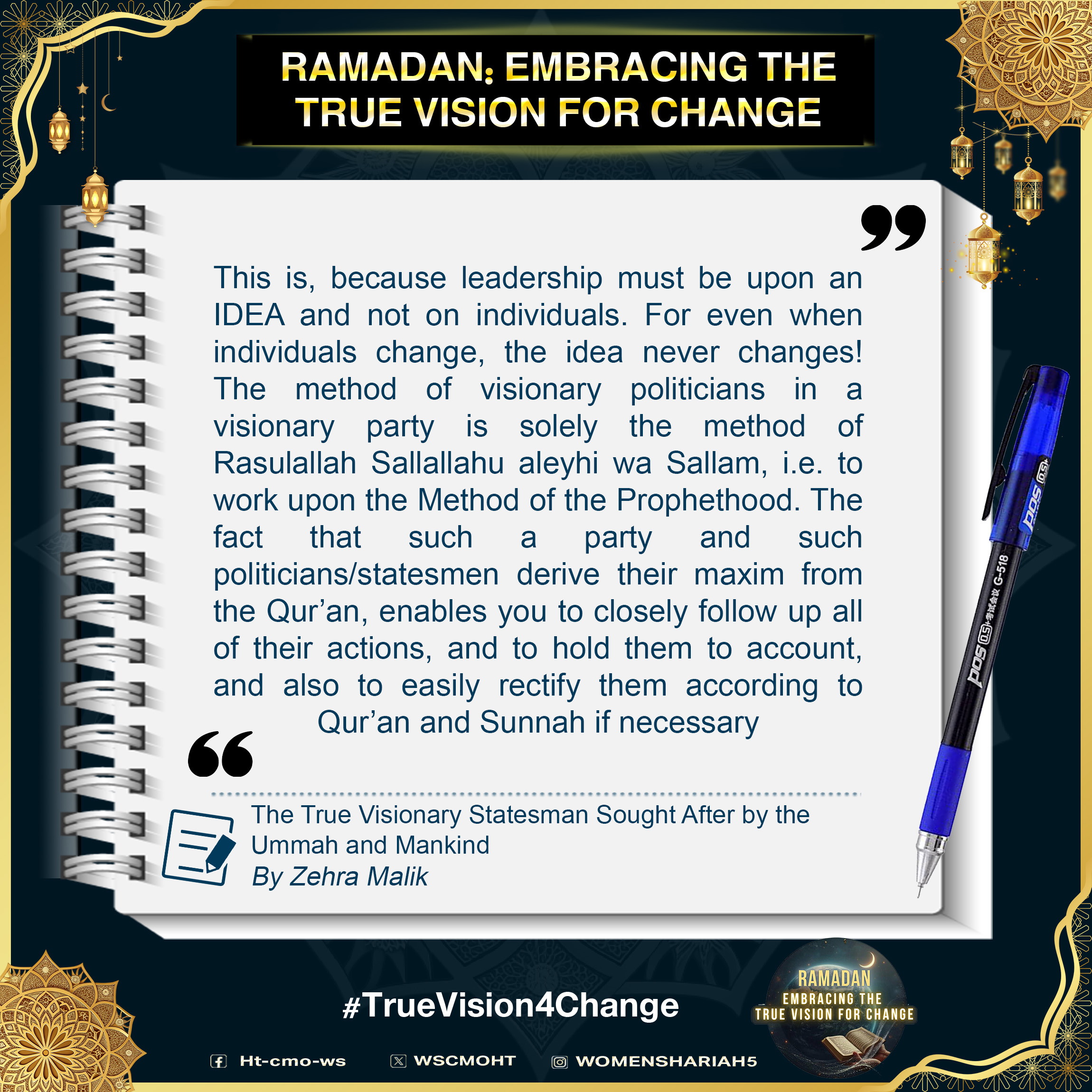اس لیے رمضان کا بابرکت مہینہ ہمارے لیے قرآن و سنت میں پیش کردہ انسانی تبدیلی کے حقیقی وژن کو سمجھنے اور اس پر غور و فکر کرنے کا موقع ہونا چاہیے، اسے کیسے حاصل کیا جائے اور اس مقصد تک پہنچنے میں بطور مسلمان ہمارا کردار۔