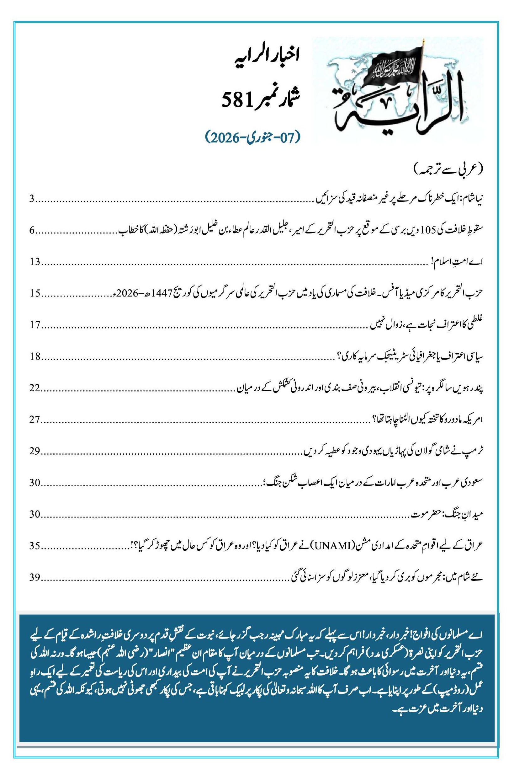 18 من رجب 1447هـ | بدھ, 07 جنوری 2026 سب سے پہلے تبصرہ کرنے والے بنیں فونٹ سائز فونٹ سائز گھٹائیں increase font size بسم الله الرحمن الرحيم رایہ اخبا ر: شمار نمبر581 7 جنوری 2026ء - 18 رجب 1447 ھ پی ڈی ایف کے لئے: یہاں کلک کریں Last modified onبدھ, 07 جنوری 2026 21:14 Latest from سقوطِ خلافت کی 105 ویں برسی کے موقع پر حزب التحریر کےامیر ریاستوں کی سلامتی اور عوام کے سیاسی خودمختاری کا مذاق خلافت کے خاتمے کی 105 ویں برسی پر رفح کراسنگ کا کھولا جانا اور مغربی کنارے کے مکینوں پر عائد پابندیوں رعایت و عزیمت (الرخصة والعزيمة) More in this category: « نصرة میگزین / شمارہ 88 Leave a comment Make sure you enter the (*) required information where indicated. HTML code is not allowed. Name * ای میل * Website URL Enter the two words you see below Message * آپ کا پیغام یہاں درج کریں ... اوپر کی طرف جائیں