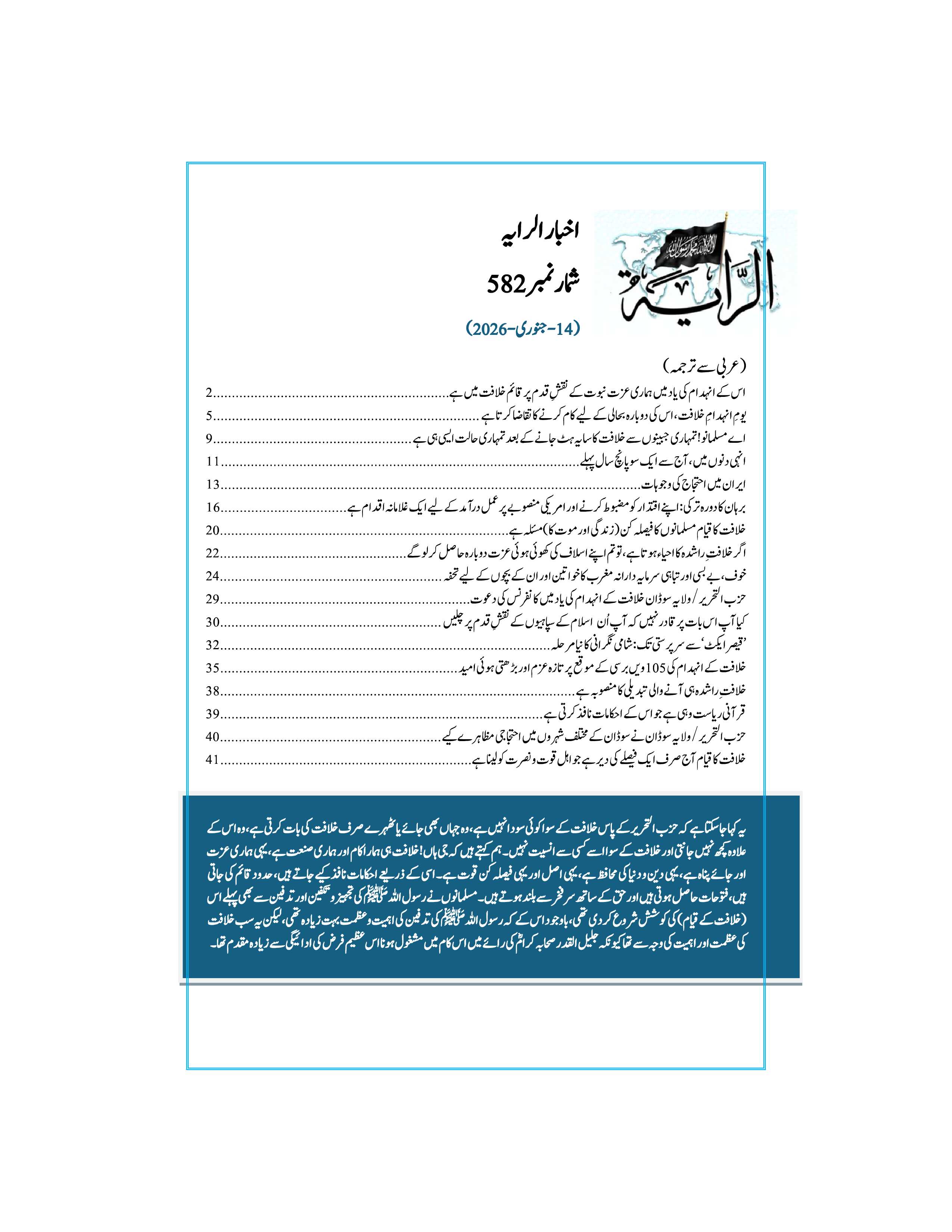 25 من رجب 1447هـ | بدھ, 14 جنوری 2026 سب سے پہلے تبصرہ کرنے والے بنیں فونٹ سائز فونٹ سائز گھٹائیں increase font size بسم الله الرحمن الرحيم رایہ اخبا ر: شمار نمبر582 ویب سائٹ 25 رجب 1447ھ/ 14 جنوری ء2026 پی ڈی ایف کے لئے: یہاں کلک کریں Last modified onبدھ, 21 جنوری 2026 21:40 Latest from حزب التحریر / ولایہ تیونس موقف "رمضان قرآن کا مہینہ ہے... اور قرآن زندگی کا ایک طریقہ ہے" نصرة میگزین / شمارہ 89 مقبوضہ کشمیر کو پاکستانی مسلح افواج کے متحرک ہونے کی ضرورت ہے! الرایہ اخبار: شمارہ 588 کی نمایاں سرخیاں بے شک خلیفہ ڈھال ہے، جس کے پیچھے رہ کر جنگ کی جاتی ہے More in this category: « رایہ اخبا ر شمار نمبر 581 قرآن کریم کے ساتھ انسان کی فطرت » Leave a comment Make sure you enter the (*) required information where indicated. HTML code is not allowed. Name * ای میل * Website URL Enter the two words you see below Message * آپ کا پیغام یہاں درج کریں ... اوپر کی طرف جائیں