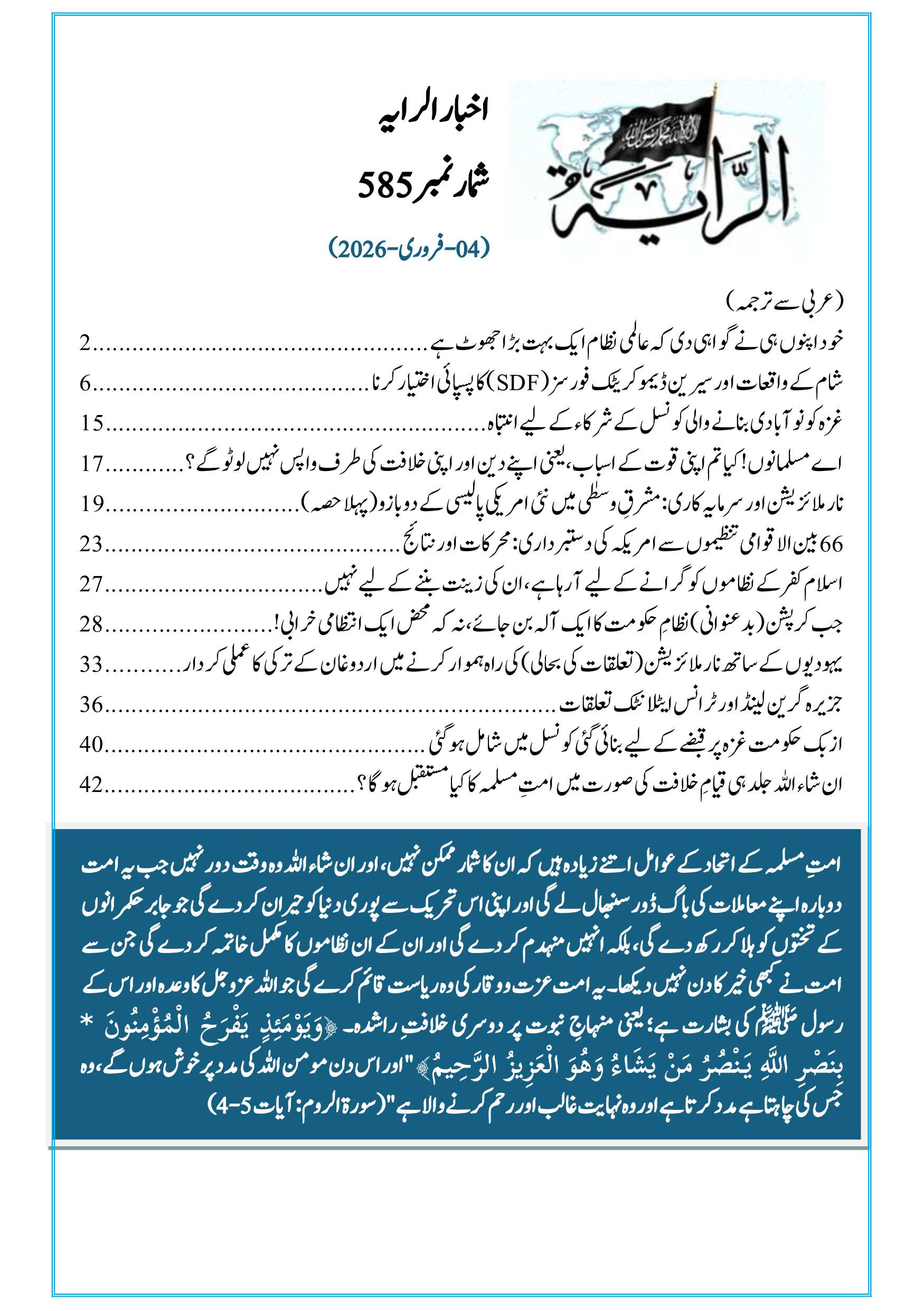 19 من شـعبان 1447هـ | ہفتہ, 07 فروری 2026 سب سے پہلے تبصرہ کرنے والے بنیں فونٹ سائز فونٹ سائز گھٹائیں increase font size بسم الله الرحمن الرحيم رایہ اخبا ر: شمارہ نمبر585 ویب سائٹ 16شعبان 1447ھ - 4 فروری 2026ء پی ڈی ایف کے لئے: یہاں کلک کریں Last modified onہفتہ, 07 فروری 2026 21:43 Latest from حزب التحریر / ولایہ تیونس موقف "رمضان قرآن کا مہینہ ہے... اور قرآن زندگی کا ایک طریقہ ہے" نصرة میگزین / شمارہ 89 مقبوضہ کشمیر کو پاکستانی مسلح افواج کے متحرک ہونے کی ضرورت ہے! الرایہ اخبار: شمارہ 588 کی نمایاں سرخیاں بے شک خلیفہ ڈھال ہے، جس کے پیچھے رہ کر جنگ کی جاتی ہے More in this category: « رایہ اخبا ر شمارہ نمبر 584 الرایہ کے متفرقات – شمارہ 586 » Leave a comment Make sure you enter the (*) required information where indicated. HTML code is not allowed. Name * ای میل * Website URL Enter the two words you see below Message * آپ کا پیغام یہاں درج کریں ... اوپر کی طرف جائیں