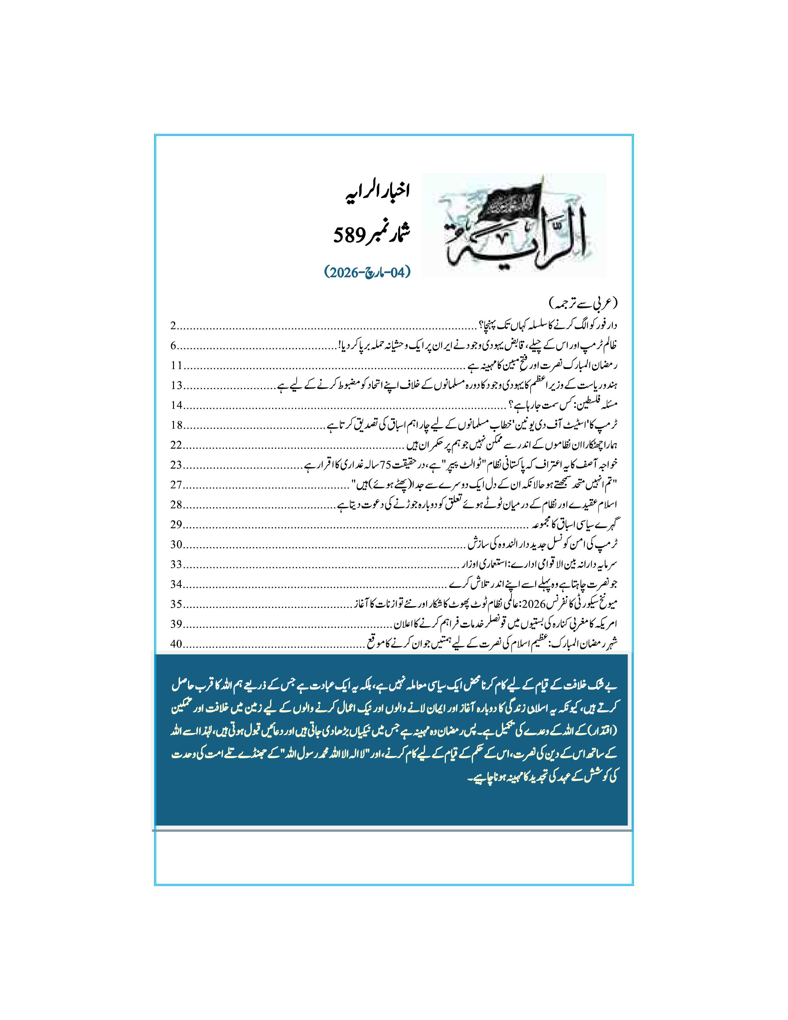 15 من رمــضان المبارك 1447هـ | جمعرات, 05 مارچ 2026 سب سے پہلے تبصرہ کرنے والے بنیں فونٹ سائز فونٹ سائز گھٹائیں increase font size بسم الله الرحمن الرحيم رایہ اخبا ر شمارہ نمبر 589 ویب سائٹ پی ڈی ایف کے لئے: یہاں کلک کریں 15 رمضان 1447ھ - 4 مارچ 2026 Last modified onجمعرات, 05 مارچ 2026 00:25 Latest from مسئلہ فلسطین: کس سمت جا رہا ہے؟ دارفور کو الگ کرنے کا سلسلہ کہاں تک پہنچا؟ ٹرمپ کا 'اسٹیٹ آف دی یونین' خطاب ٹرمپ کی امن کونسل جدید دار الندوہ کی سازش میونخ سیکورٹی کانفرنس 2026 More in this category: « نصرة میگزین / شمارہ 89 Leave a comment Make sure you enter the (*) required information where indicated. HTML code is not allowed. Name * ای میل * Website URL Enter the two words you see below Message * آپ کا پیغام یہاں درج کریں ... اوپر کی طرف جائیں